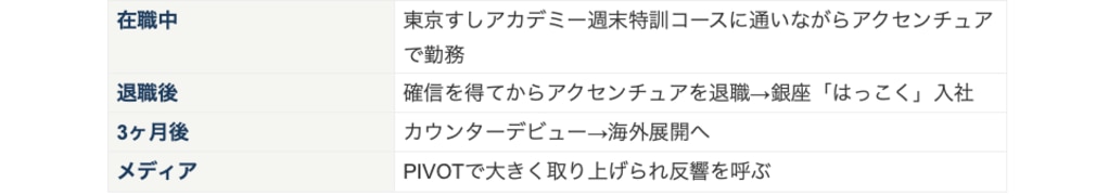 企業経営者、投資家、サラリーマンの方々に多く選ばれています。AIにできないことで自分の価値を示したい——「手を動かして、目の前の人のために何かをつくる」という行為が、寿司につながっています。