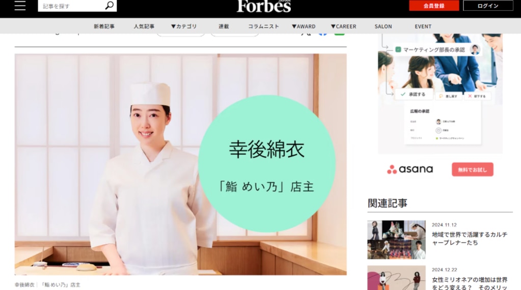 麻布十番「鮨 めい乃」の店主、幸後綿衣(こうご めい)さんが、ビジネス誌『Forbes JAPAN』で紹介され、女性寿司職人として道を切り開く情熱が注目されました。